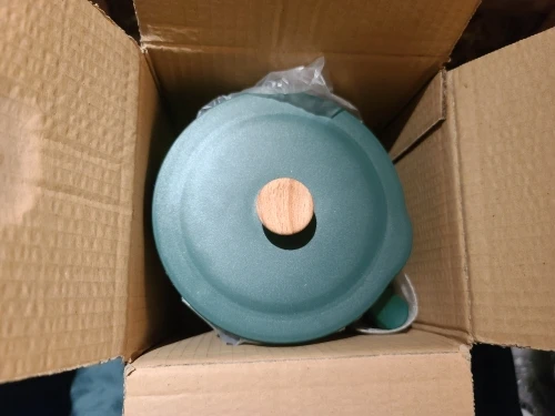 Very good quality oil jug-factory, the material is dense, the coating is uniform. The infill is very thick. Plastic cover and handle. The cover sits tightly. There is a pallet under the pitcher, metal. The color corresponds to the seller's photos. The outer box is dense, the jug arrived in perfect condition. The only pity is that not 2 liters, but so the pitcher is perfect.